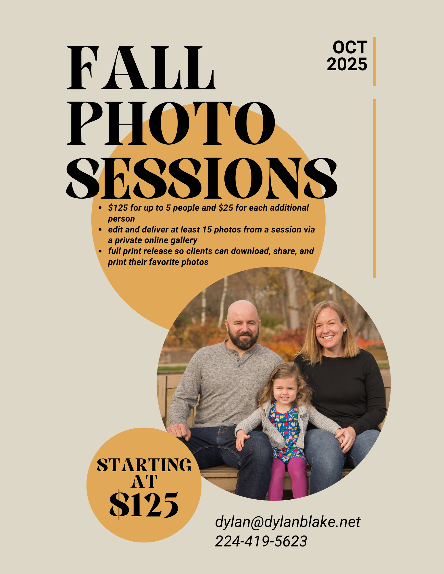 It's time to capture the magic of fall with a photo session this season! Whether you want to update your family portraits, get some stunning shots of you and your significant other, or simply celebrate the season, I'm here to help. Don't let these beautiful moments slip away. Book your session today and get ready to create lasting memories. Ready to capture the beauty of the season? Reach out to me via email at dylan@dylanblake.net or call/text at 224-419-5623.